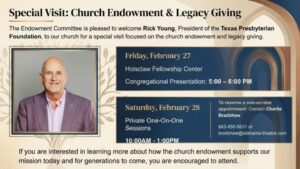 As we celebrate Christ’s gift of salvation, our grateful worship of God guides us to ensure the vision of our church and its future. As the Pawleys Island Presbyterian Church congregation continues to trust, to believe and to carry out this mission, our Session has established a permanent Endowment Program to support this work during the course of our lifetime and beyond.